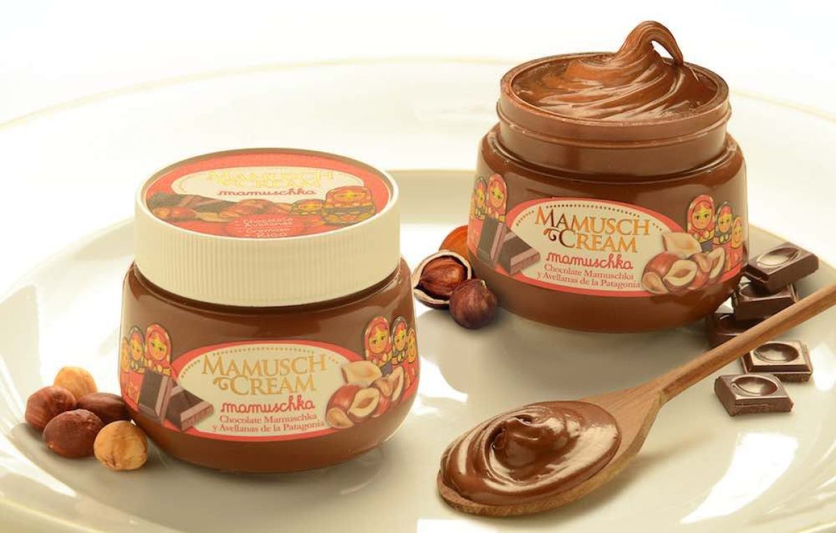 Crema untable de chocolate Mamuschka y avellanas de la Patagonia. Ideal para desayunos con pan o combinada con frutas. Excelente para untar crepes y panqueques. Mamusch Cream, el spread más rico de chocolate y avellanas.