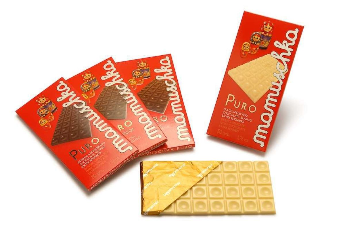 En el chocolate blanco la presencia del cacao es sólo a través de la manteca de cacao. En este caso de origen Brasil. Además es muy importante remarcar que el sabor más preponderante del producto es fruto de la calidad de la leche argentina y en particular la utilizada por Mamuschka. Además de leches se utiliza azúcar de caña argentina. Cabe mencionar esto ya que en otros países utilizan azúcar de remolacha.