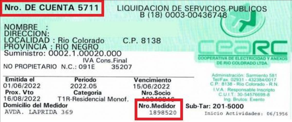 Usuarios de CEARC (Río Colorado): número de cuenta y medidor