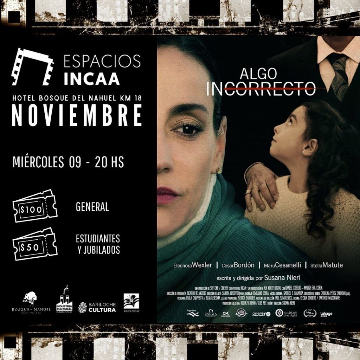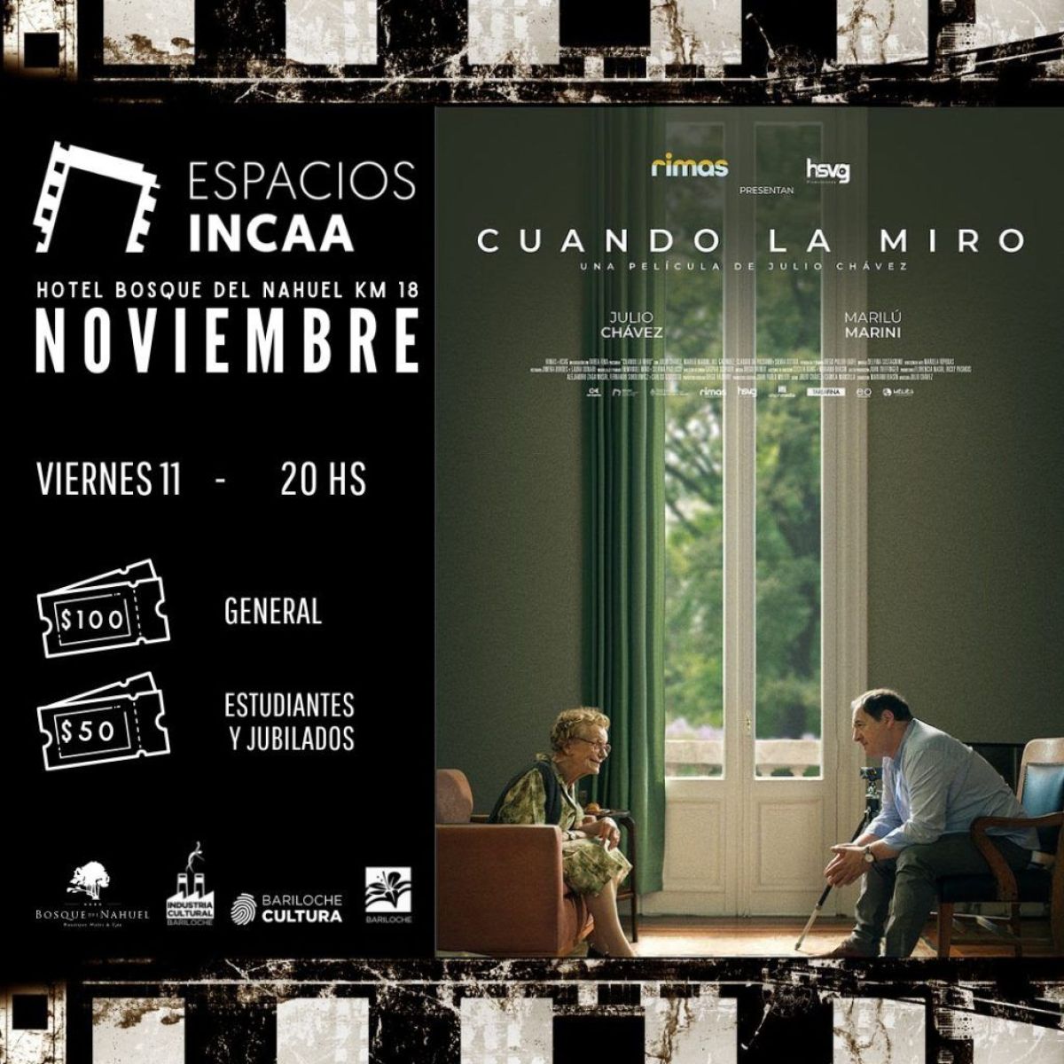 La Subsecretaría de Cultura de la Municipalidad comunica la programación de los Espacios INCAA Bariloche de esta semana para las salas de la Escuela Municipal de Arte La Llave y del Hotel Bosque del Nahuel del Km 18. Y al final, cómo hacer para reservar.