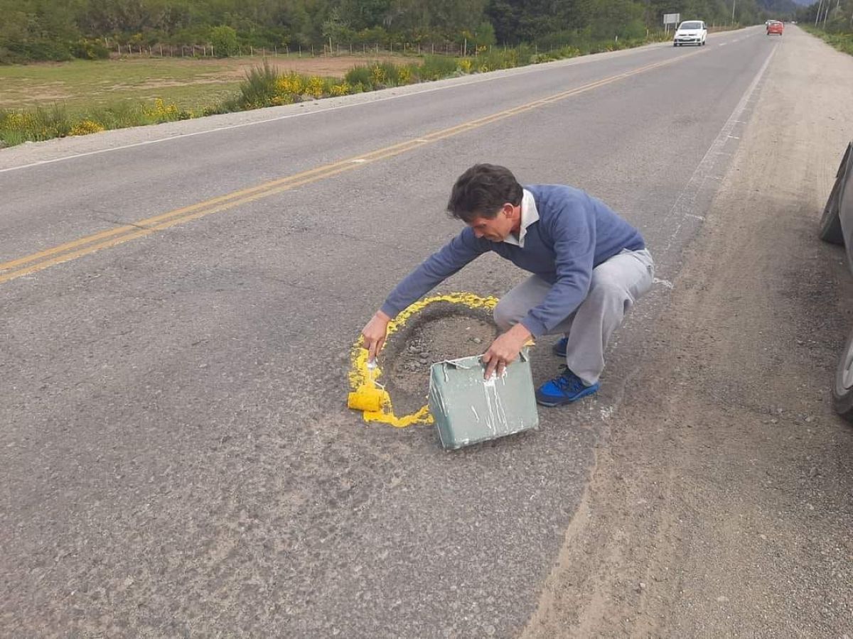 Esta acción fue realizada por el escribano y referente del PJ, Leandro Costa Bruten, quien marcó con pintura amarilla los baches existentes hace unos días.