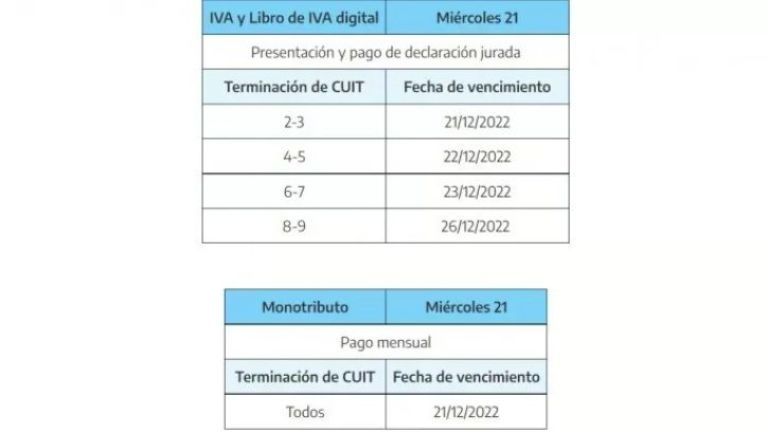 En esta línea, los vencimientos de presentaciones y pagos fijados para el martes 20 de diciembre serán trasladados al miércoles 21 de diciembre.