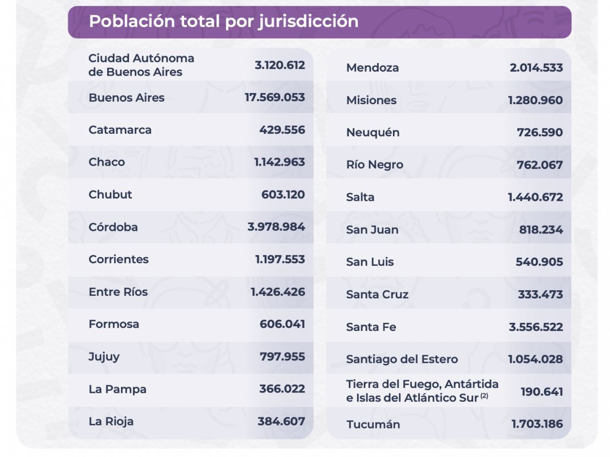 Entre los resultados provisionales, se informó el total de población por sexo, según provincia y departamento, partido o comuna; y la población en viviendas particulares, en viviendas colectivas y en situación de calle, por provincia y departamento, partido o comuna.