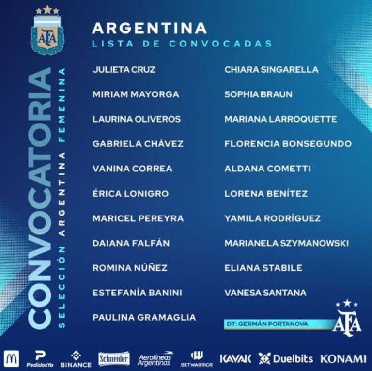 Las 21 jugadoras convocadas por el entrenador son las siguientes: Vanina Correa, Laurina Oliveros, Julieta Cruz, Miriam Mayorga, Gabriela Chávez, Érica Lonigro, Maricel Pereyra, Daiana Falfán, Romina Núñez. Estefanía Banini, Paulina Gramaglia, Chiara Singarella, Sophia Braun, Mariana Larroquette, Florencia Bonsegundo, Aldana Cometti, Lorena Benítez, Yamila Rodríguez, Mariela Szymanowski, Eliana Stábile y Vanesa Santana.