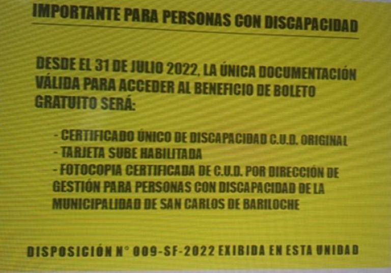 En atención a las consultas e inquietudes recibidas por el área de parte de los usuarios les recordamos que a partir del 31 de julio la única documentación válida para acceder al transporte gratuito para personas con discapacidad es: