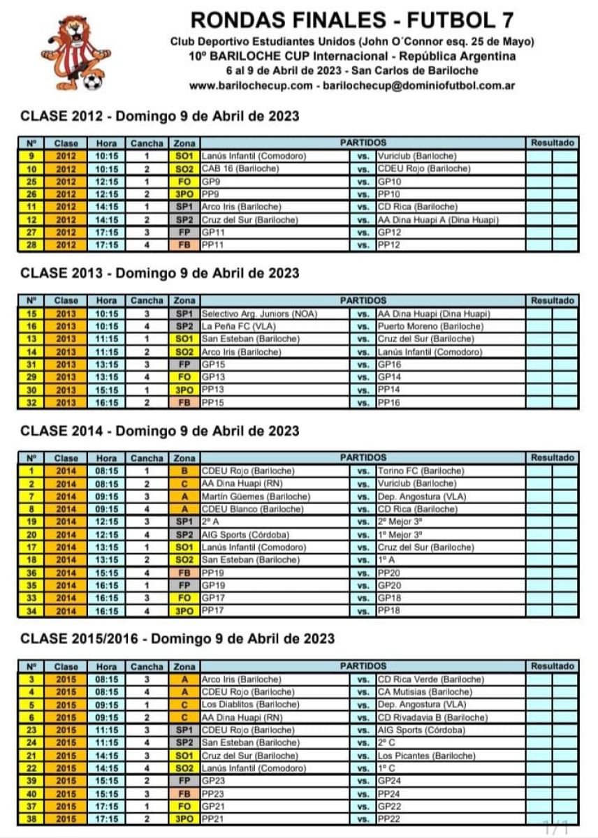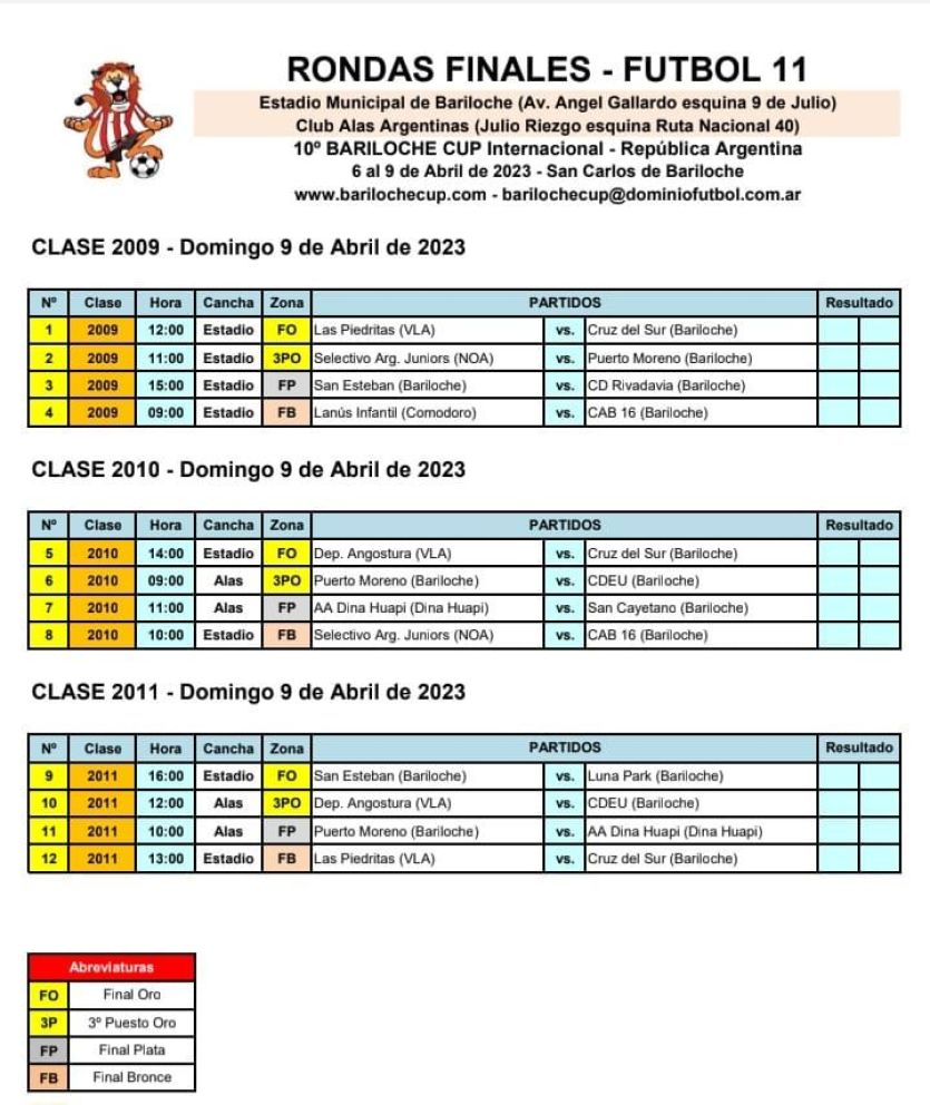 Con fuerte presencia local, clubes de Argentina y Chile, de ciudades cercanas como Villa la Angostura, Dina Huapi, Maquinchao y otras que hicieron muchos kilómetros para participar como Comodoro Rivadavia, Córdoba, Salta y de la localidad de Osorno del vecino país, afrontarán este domingo las rondas finales del torneo que premiará con Copas de Oro, Plata y Bronce.
