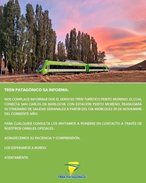 Autoridades del Tren Patagónico informaron que a partir del miércoles 29 de noviembre volverá a realizar el trayecto que une la ciudad de San Carlos de Bariloche con Perito Moreno.