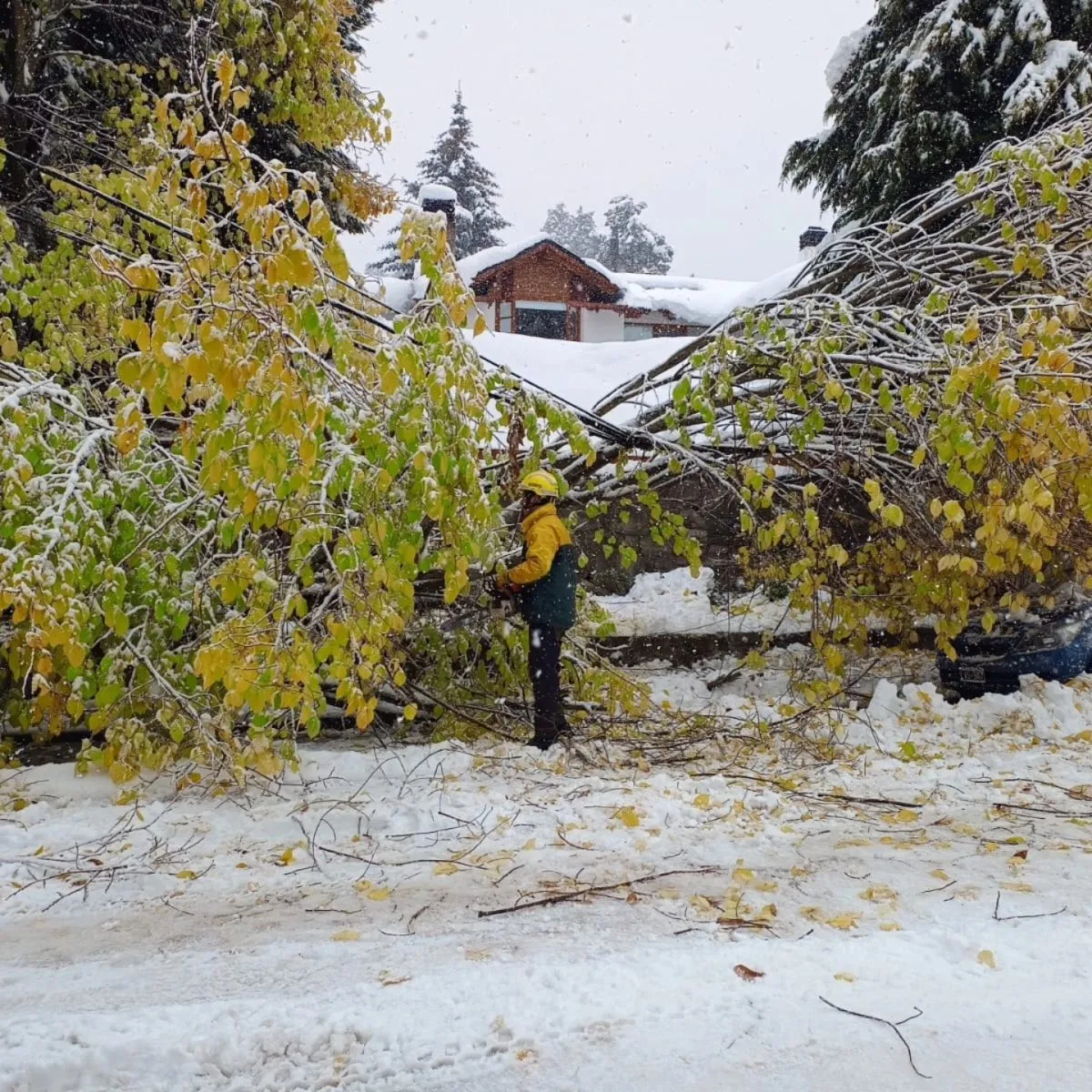 Personal del Servicio de Prevención y Lucha contra Incendios Forestales (SPLIF) de Bariloche intervino hoy para remover un árbol de gran porte que cayó sobre un automóvil en la calle Videla al 600, producto de la intensa nevada que azotó la ciudad en las últimas horas.