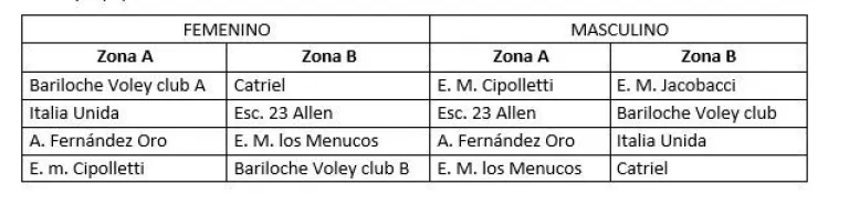 La Zona 1 abarca equipos del Sur y Alto Valle Oeste y la Zona 2 el Valle medio, Alto Valle Este y  Atlántica. El pasado fin de semana en Viedma, la categoría Sub18 ya tuvo su primer compromiso del año en la Zona 2 y ahora es el turno de la Zona 1, con la Escuela Municipal de Catriel, Escuela Municipal de Cipolletti, Asociación de Vóley Fernández Oro, Escuela 23 de Allen, Escuela Municipal de Ingeniero Jacobacci, Asociación Italia Unida y el Bariloche Vóley Club, entre otros equipos.