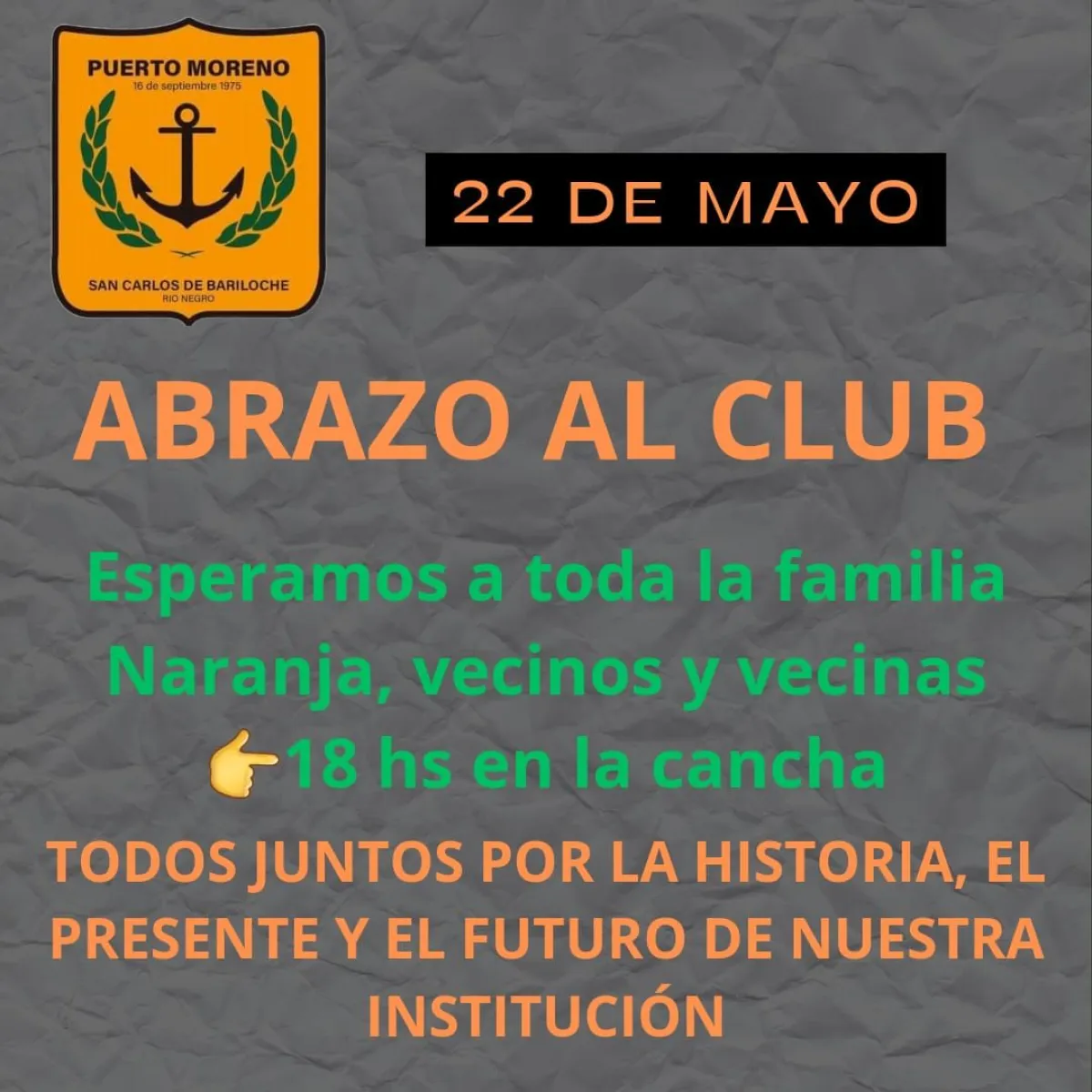 “Quieren desalojar a los vecinos y después vienen por nosotros” expresaron desde Puerto Moreno hace algunos días, proponiendo juntar firmas para enviar una carta y ahora organizan un abrazo simbólico al club, este miércoles 22 de mayo a las 18 horas “El miércoles 22 de mayo haremos un abrazo simbólico en nuestro club a las 18 hs. Es muy importante su presencia, la de los niños, niñas, jugadores y jugadoras naranjas y toda la familia del club” informaron este martes.