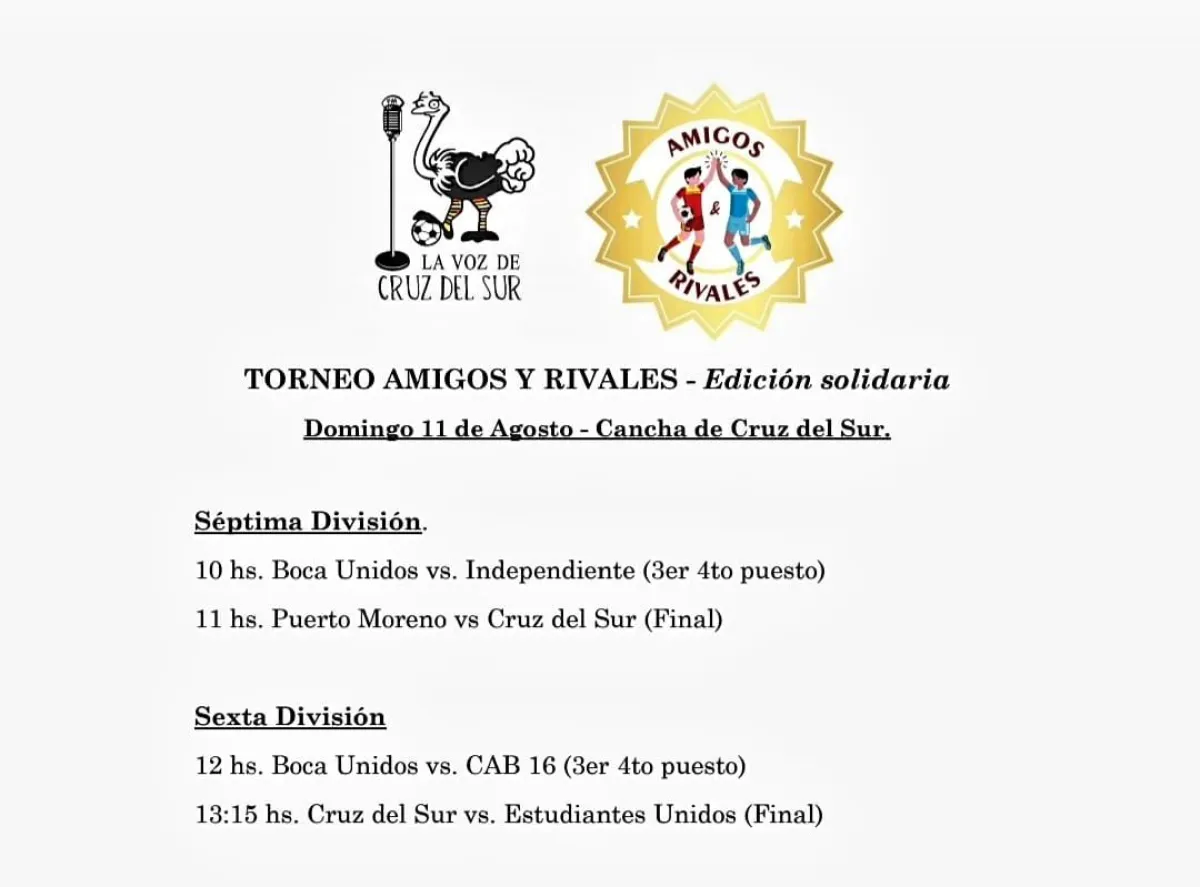 La propuesta de fútbol que organiza el programa radial “La Voz de Cruz del Sur” que se emite los sábados de 12 a 14 horas por Radio C – FM 107.3 y que se inició el último domingo de julio en “La Cantera”, cancha del Club Deportivo Cruz del Sur, con partidos de 6ta y 7ma División finalizará este 11 de agosto en el mismo recinto.