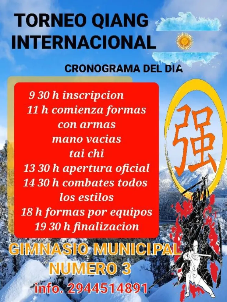 La cita es este sábado, desde las  9.30 horas se abren las inscripciones, a las 11 se comenzará con las Formas con Manos Vacías y armas de Tai Chi. La apertura formal está pautada para las 13.30 y a las 14.30 será el turno de los combates de todos los estilos. A las 18.30 se realizarán las Formas por Equipo y la finalización del evento está prevista para las 19.30 horas.