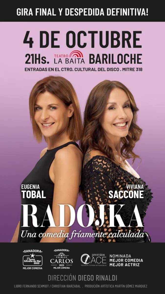 El viernes 4 de octubre, a las 21 horas, se presentará Radojka, una comedia que ha recibido elogios de la crítica y el público en los últimos años. Protagonizada por las actrices Viviana Saccone y María Eugenia Tobal, y dirigida por Diego Rinaldi, esta obra uruguaya escrita por Fernando Schmidt y Christian Ibarzabal combina el humor inteligente con el suspenso y una aguda crítica social. Es una propuesta ideal para aquellos que buscan una experiencia teatral cargada de risas y reflexión.
