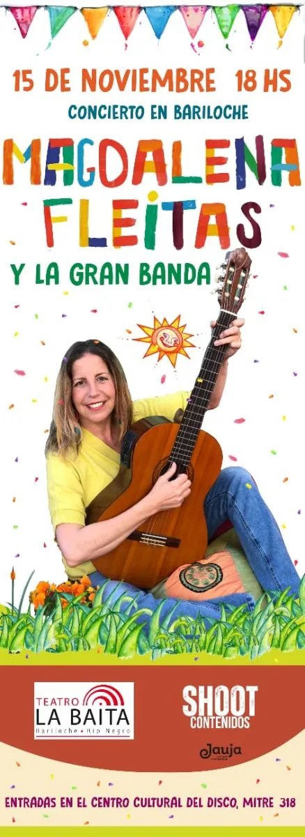 El 15 de noviembre, la artista y educadora Magdalena Fleitas subirá al escenario acompañada de su banda. Fleitas, ganadora de múltiples premios Gardel, ofrecerá un espectáculo que combina música, arte y salud, con un repertorio que se nutre del folklore argentino y latinoamericano. Con más de 200 canciones en su carrera, esta será su primera presentación en Bariloche, un evento ideal para disfrutar en familia.