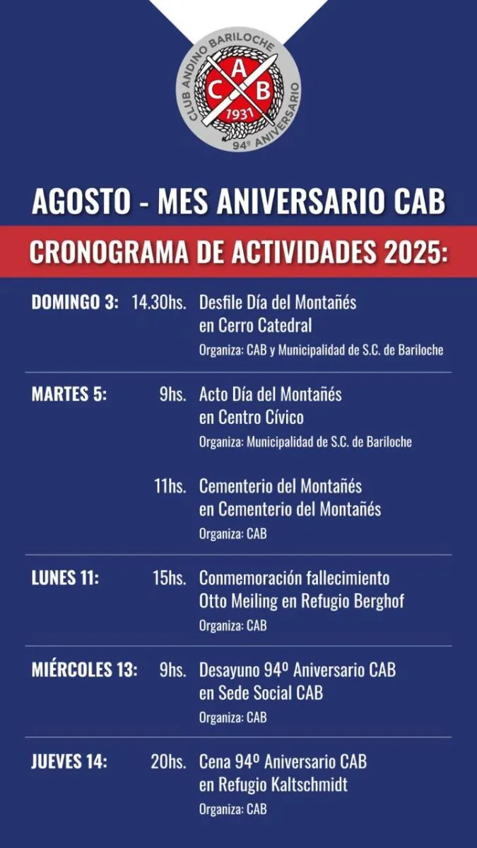 El mes de agosto será especial para el Club Andino Bariloche (CAB), que celebra su 94° aniversario con una serie de actividades abiertas a la comunidad, comenzando el próximo domingo.