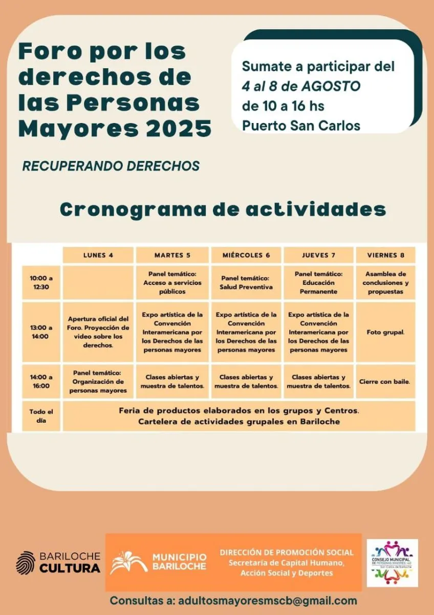 Del 4 al 8 de agosto, Bariloche será sede del Foro por los Derechos de las Personas Mayores 2025, un espacio de participación activa bajo el lema “Recuperando derechos”, que tendrá lugar en el Puerto San Carlos de 10 a 16 horas. La propuesta busca visibilizar, fortalecer y garantizar el acceso a derechos de las personas mayores, con actividades dirigidas tanto a ellas como a familiares, cuidadores y público general.