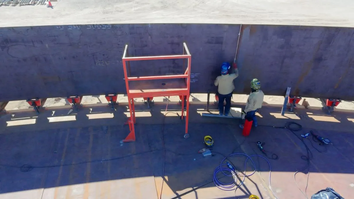 Actualmente, el primer tanque ya conformó su primer anillo y comenzó la soldadura del segundo, mientras que el segundo tanque finaliza su primera etapa. Además, se inició el montaje del tanque de agua destinado a la protección contra incendios.
