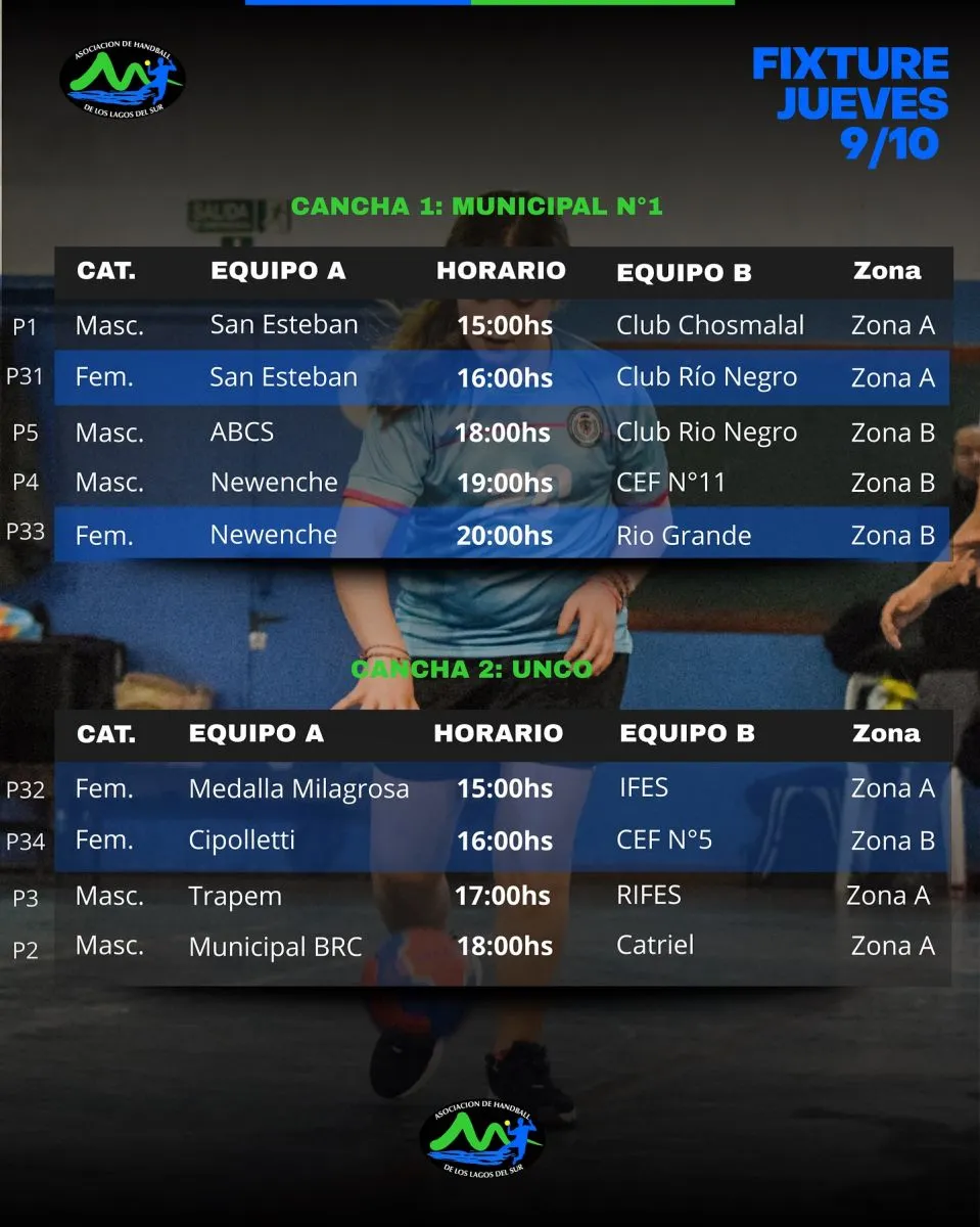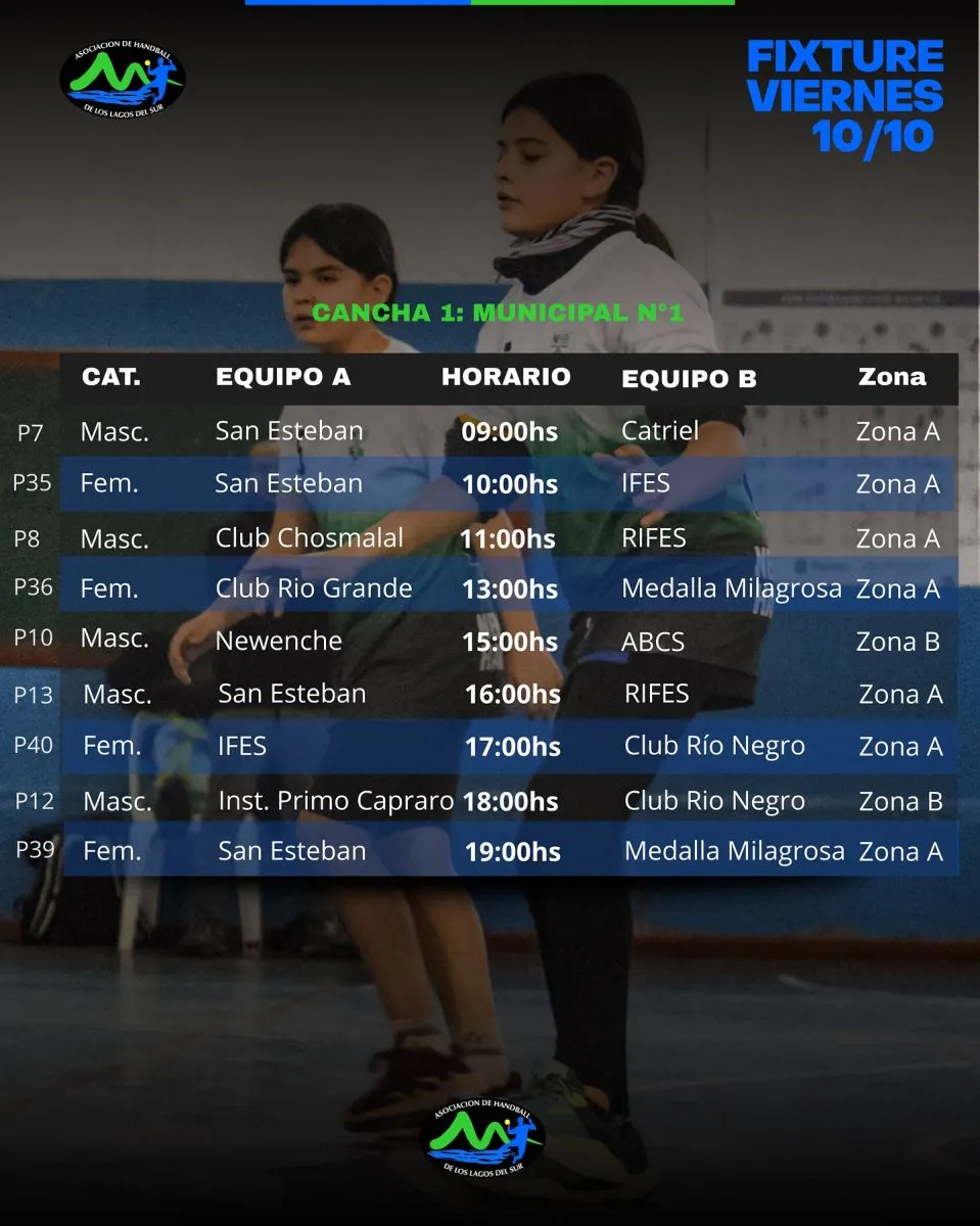 En el “Muni 1” San Esteban de Bariloche y el Club Chos Malal serán los encargados de abrir la jornada, que tendrá otros cuatro encuentros en ese recinto, mientras que en el Gimnasio de la UNCO, Medalla Milagrosa también de nuestra ciudad, abrirá el cronograma de encuentros ante IFES de Neuquén y luego se jugarán otros tres partidos.