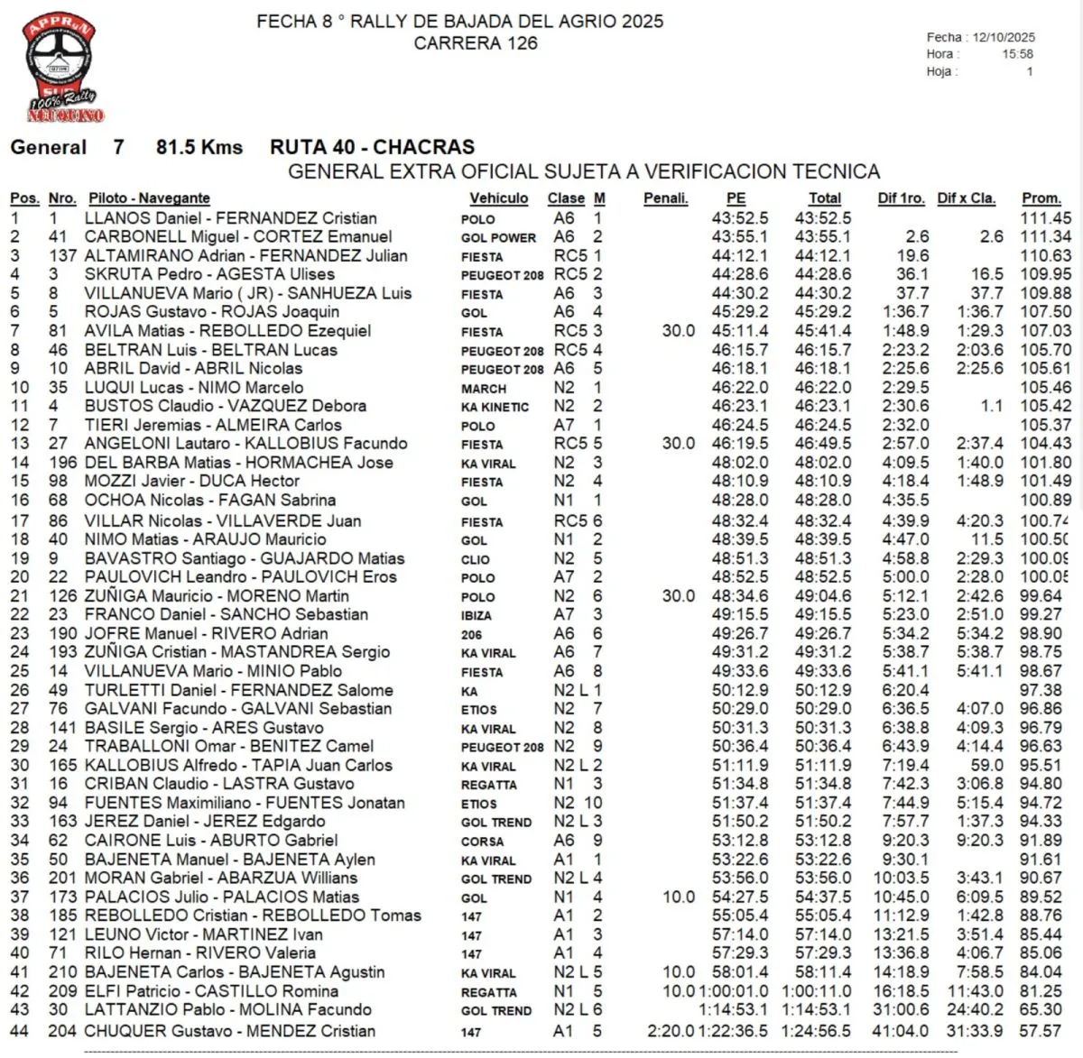 El de Bariloche ganó la Clasificación General por menos de tres segundos, en una lucha metro a metro que tuvo con la dupla de Cipolletti de Miguel Carbonell – Emanuel Cortez, que había ganado la primera etapa el día sábado y diferencia que Daniel Llanos, que ante la ausencia de su habitual navegante Federico Centani, tuvo en la butaca derecha a Cristian Fernández Pizarro, salió a recortar y de gran manera en la decisiva etapa del domingo.