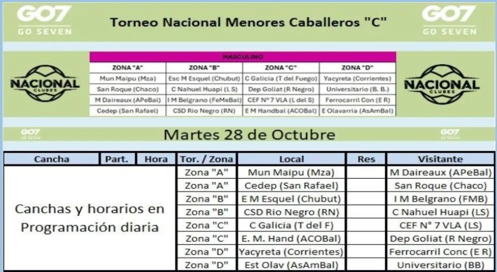 En varones, los representantes del Club Nahuel Huapi comparten la Zona “B” y su debut será este martes 28 de octubre ante CDS Río Negro, en tanto que el otro equipo de la Asociación Lagos, el CEF Nº 7 de Villa la Angostura, estará en la Zona “C” y su primer partido será mañana ante C. Galicia de Tierra del Fuego.