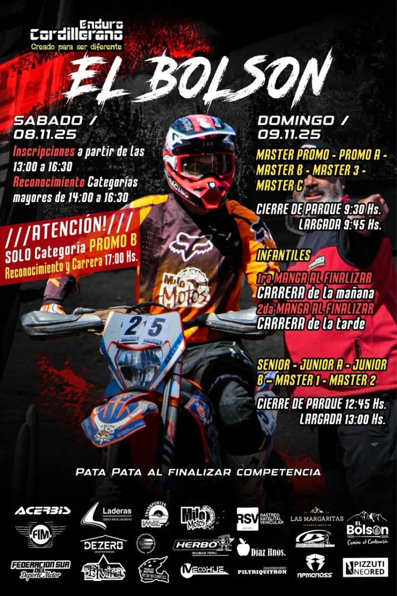 Se corre este sábado 8 y domingo 9 de noviembre en el Cerro Perito Moreno de El Bolsón la sexta fecha del calendario del Enduro Cordillerano, que “sorpresivamente” cierra su campeonato este mes, ya que luego de Bariloche, que fue la cita del mes pasado, dos localidades que iban albergar el certamen en la parte final del año se bajaron por distintos inconvenientes y el circuito bolsonense, que ya había sido escenario de la segunda jornada de este mismo campeonato, salió “al rescate” para cumplir con un mínimo de seis fechas y poder coronar a los campeones.