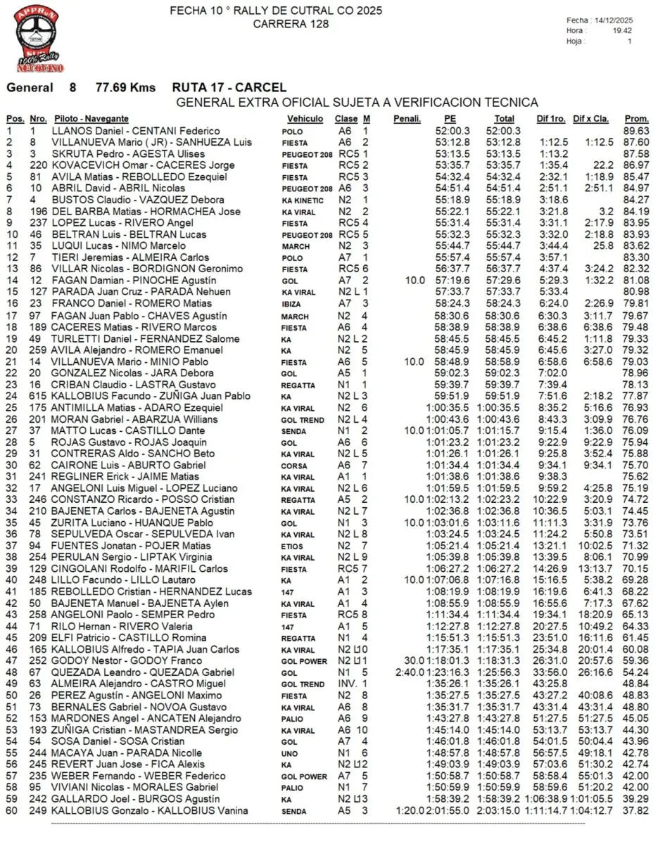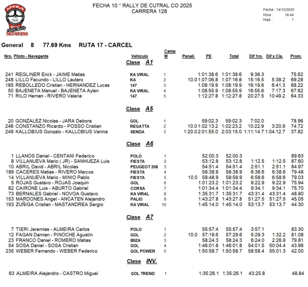 En la Clasificación General, un intratable Daniel Llanos, el barilochense que es navegado por Federico Centani, logró liderar nuevamente la competencia, sumando su tercer triunfo consecutivo en la General, el cuarto seguido en la Clase A6, donde una fecha antes ya se había asegurado el bicampeonato y la quinta victoria de la temporada, en un apabullante 2025.
