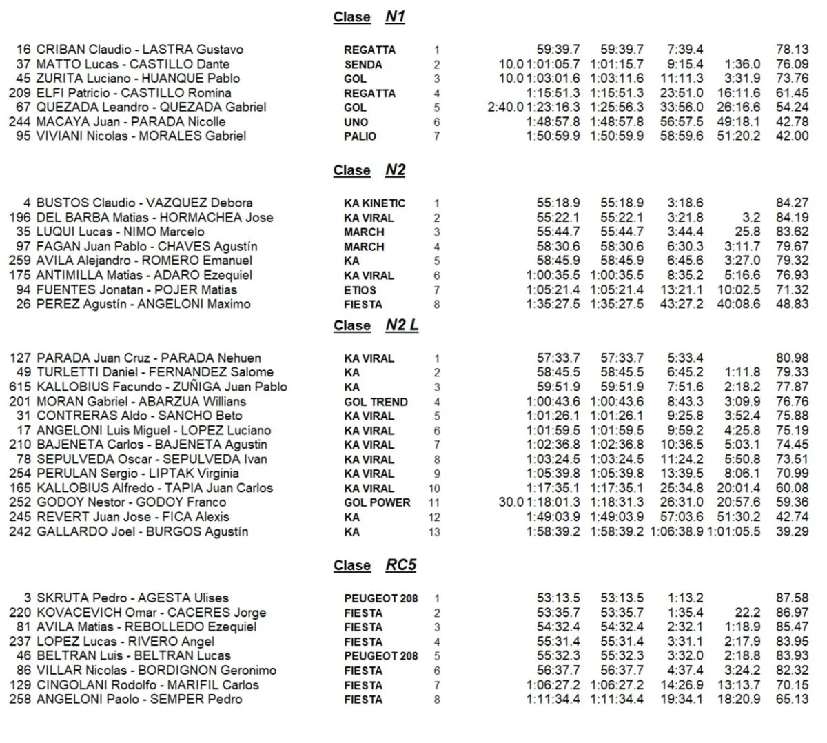 Mario Villanueva JR – Luis Sanhueza escoltaron a Llanos-Centani en la General y en la A6, a un minuto 12 segundos, mientras que los campeones de la Clase RC5, Pedro Skruta – Ulises Agesta de Junín de los Andes, se ubicaron en el tercer lugar de la Clasificación General (que cerró con un total de 60 duplas), a 1.13 de Llanos y ganaron por cuarta vez en el año su categoría.