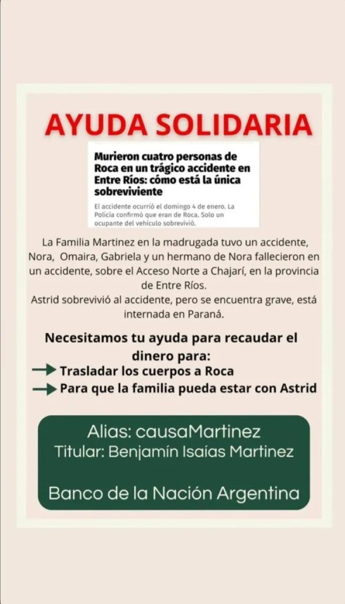 Ante esta situación, familiares y allegados iniciaron un pedido de ayuda solidaria para afrontar los altos costos del traslado de los cuerpos hacia General Roca, así como los gastos que implica la permanencia de la familia en Entre Ríos para acompañar a Astrid durante su recuperación y cumplir con los trámites correspondientes.