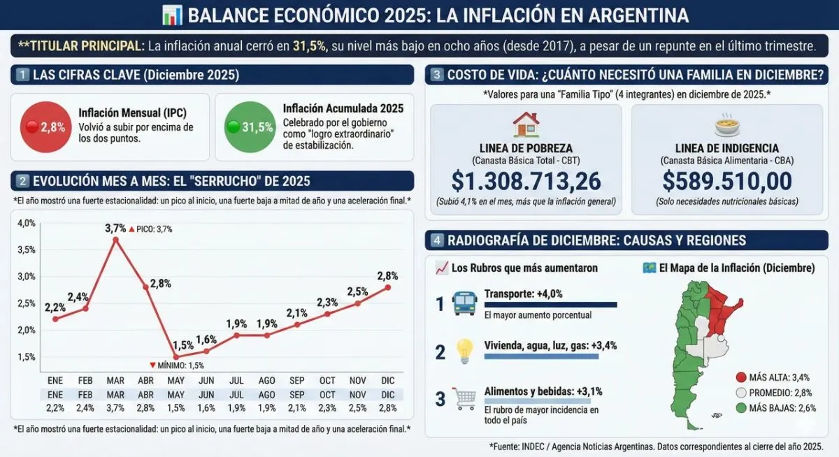El INDEC presentó este martes el último reporte de precios de 2025, confirmando que la inflación de diciembre volvió a situarse por encima de los dos puntos. A pesar del incremento mensual, el año finalizó con una variación del 31,5%, consolidándose como la cifra anual más baja desde 2017.